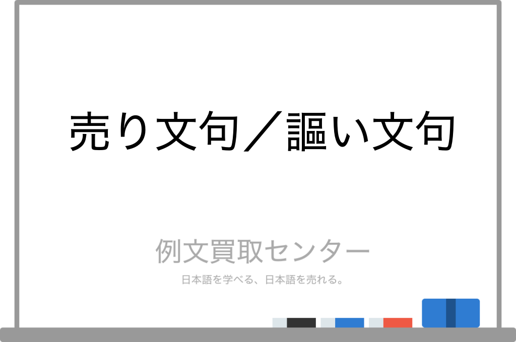 似た意味を持つ「売り文句」(読み方:うりもんく)と「謳い文句」(読み方:うたいもんく)の違いを例文を使って分かりやすく解説しているページです。